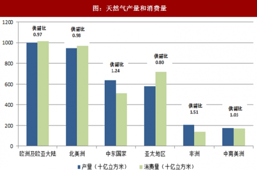 天然气生产和消费具有较好的区域平衡性。欧洲及欧亚大陆、北美洲、中东、亚太地区、非洲、中南美洲天然气供需比(产量与消费量的比例)分别为0.97、0.98、1.24、0.80、1.51、1.03。亚太地区是唯一一个供需比显著低于1 的地区,也反映了亚太地区的天然气短缺问题。