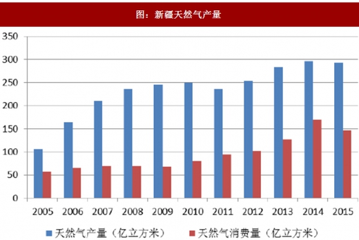 根据数据,2015 年新疆天然气产量293.02 亿立方米,占全国的21.77%,而消费量只有145.81 亿立方米,占全国的7.55%。新疆肩负着为全国输送天然气资源的使命,能源战略地位不容小视。