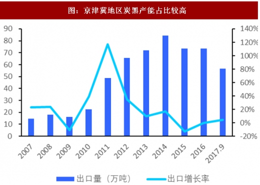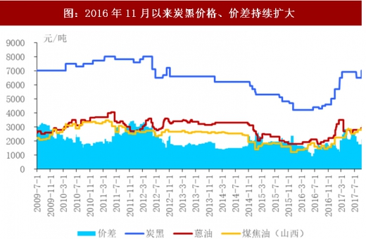 油价上涨下国内煤焦油工艺比价优势将凸显。国内炭黑制造以煤焦油工艺路线为主,而海外主要以乙烯焦油作为原料,2016年以来原油价格显著走高,从30美元/桶上涨至55美元/桶水平,乙烯焦油价格回升下国内炭黑企业原料油比价优势逐步凸显,将略微提振出口需求。