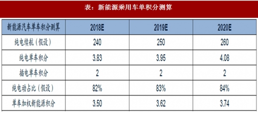 由免购置税新能源汽车合格证数据,目前新能源乘用车中纯电动乘用车合格证占比已超80%,我们假设2018-2020年我国新能源乘用车中纯电动车型产量占比分别为82%、83%、84%,插电车型单车积分均为2分,纯电车型积分为以上推算的3.83、3.95、4.08,则2018-2020年我国新能源乘用车单车积分分别约为3.50、3.62、3.74。