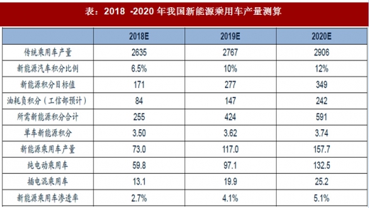 双积分政策中对2018年新能源积分8%的比例要求在2018年不做考核,考虑到车企的油耗压力、2019年与2020年新能源积分合并核算、满足2019年10%的比例应是一个渐变的过程,我们保守假设2018年我国新能源积分比例为6.5%,在2016-2020年我国传统乘用车产量年复合增速为5%的假设下,2018-2020年我国新能源乘用车产量分别约为73、117、158万辆。