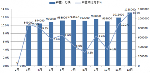 2015年12月中国集成电路产量为1128000万块,同比增长13.1%。2015年1-12月止累计中国集成电路产量10872000万块,同比增长6.8%。