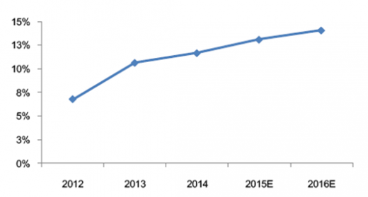 截至2014年底,中国占全球半导体消费市场的份额已达到了创纪录的56.6%。过去11年中国市场复合年增长率达到了18.8%,而同期全球芯片消费的复合年增长率仅为6.6%。