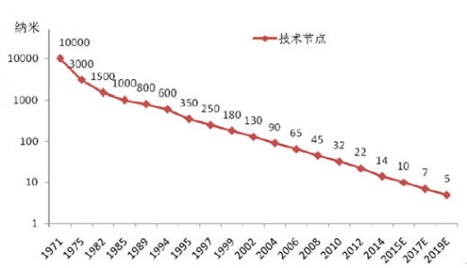 集成电路产业按照摩尔定律持续发展,制程节点不断缩小,今年将量产10 纳米。摩尔定律是由英特尔(intel)创始人之一戈登〃摩尔(gordon moore)于1965 年提出来的。其内容为:当价格不变时,集成电路上可容纳的元器件的数目,约每隔18-24 个月便会增加一倍,性能也将提升一倍。几十年来,集成电路产业沿着摩尔定律发展,1971年集成电路的制程节点是10 微米(百分之一毫米),今年台积电将开始量产10 纳米(十万分之一毫米),技术节点缩小到千分之一,意味着晶体管面积缩小百万分之一。
