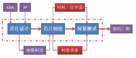 半导体设备和材料处于ic 产业的上游,为ic 产品的生产提供必要的工具和原料。当前ic 产业的商业模式可以简单描述为,ic 设计公司根据下游客户(系统厂商)的需求设计芯片,然后交给晶圆代工厂进行制造,之后再由封装测试厂进行封装测试,最后将性能良好的ic 产品出售给系统厂商。ic 设计、晶圆制造、封装测试是ic 产业的核心环节,除此之外,ic 设计公司需要从ip/eda 公司购买相应的ip 和eda 工具,而ic 制造和封装测试公司需要从设备和材料供应商购买相应的半导体设备和材料化学品。因此,在核心环节之外,集成电路产业链中还需要ip/eda、半导体设备、材料化学品等上游供应商。