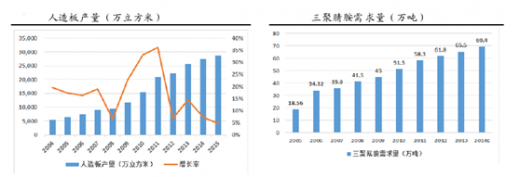 2015年人造板总产量近2.87亿立方米,根据每立方米人造板需要300吨尿素计算,2015年人造板用尿素大约为861万吨。我国现有人造板生产企业近10000家,产量保持稳定增长。