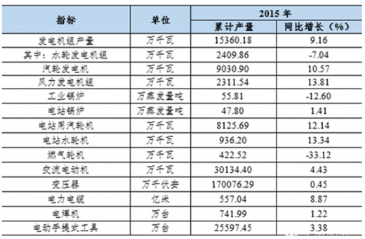 2015年,随着行业规模的稳步扩张,大部分电力设备产品产量实现增长。总体来看,在中国机械工业联合会统计的14类产品中,有11类产品产量实现增长,其中风力发电机组、电站水轮机、电站用汽轮机、汽轮发电机产量实现两位数增长,增速分别为13.81%、13.34%、12.14%和10.57%;而燃气轮机、工业锅炉、水轮发电机组产量出现下降,降幅分别为33.12%、12.60%和7.04%。其中,燃气轮机产量降幅最大主要是受气价调整、投资效益差等因素影响,燃气轮机市场需求回落。