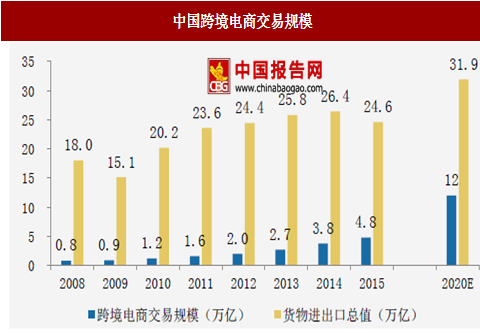 我国跨境出口电商行业经历多年的发展,尤其是2010年后的爆发式增长,目前已经形成了巨大的市场规模。截至2015年,我国跨境电商交易规模为4.8万亿元,同比增长约26%,并且跨境电商交易规模占整体货物进出口比重也处于持续上升趋势之中,截至2015年该比重接近20%。根据预测,2016-2020年,中国跨境电商交易规模仍能保持年均20.1%的复合增速,到2020年跨境电商交易规模达到12万亿元,占整体货物进出口比重超过37%。