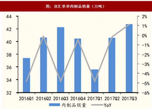 常温肉制品方面,双汇市场份额近60%。近三年由于产品老化出现负增长,作为行业绝对龙头的双汇有能力提升产品结构或直接提价,保持低速增长。低温肉制品方面,低温肉制品加工工艺可最大限度保留原有营养,在品质上明显好于高温肉制品,是消费升级的方向。双汇2015年年底引入高端smithfield就是为了拉动低温肉制品消费,但新品牌推广培育需要时间,下一步公司将制定新的营销战略,持续提升smithfield品牌的影响力和市场占有率。2017年前三季度双汇陆续推出了多种新品,与以往新品推广相比,今年新品开发推广都是经过了深入的市场调研,未来产品开发的方向都将围绕稳高温上低温,大力发展美式西式产品、中式产品工业化、休闲产品更休闲、调理食材产品工业化、肉蛋奶菜粮结合的大健康道路,开发切合市场,适应消费者口味的产品。