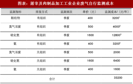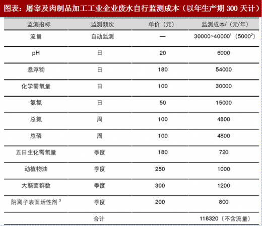 日常监测成本:根据《屠宰及肉类加工规范编制说明》日常监测成本中年屠宰量在 10 万头及以上的企业日常自行监测成本约 15 万元(不含流量),如果考虑流量计的设备购置费用和年运行维护费用,则需要 19 万元左右,实施简化管理的屠宰及肉类加工工业(年生猪屠宰量在 10 万头以下的)日常监测为每个季度 1 次即可,日常自行监测成本约 4 万元(不含流量),如果考虑流量则需要 8 万元左右。