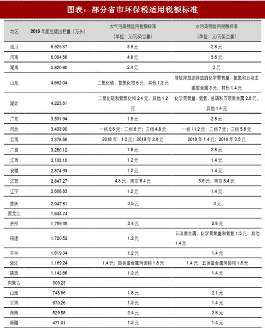 生猪养殖大省地区环保税基本均是在最低标准的基础上提升了。各省大气污染物和水污染物的环保税具体税额分别按每当量 1.2 元-12 元、每当量 1.4 元-14 元幅度征收,各地可根据实际情况在该幅度内确定具体标准。生猪养殖大省河南、河北是最低标准的 3-5 倍,四川、湖南是最低标准的 2-3 倍,山东、湖北、广东也都适当在最低标准的基础之上有所提升。
