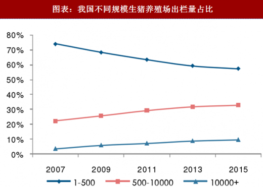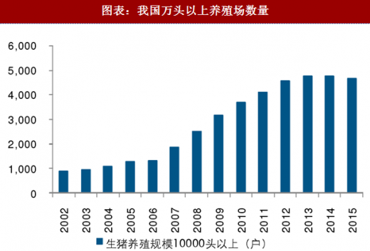 环保趋严背景下,上游养殖规模化带动下游屠宰规模化。上游养殖分散,直接影响了屠宰行业的集中度,目前上游养殖规模化程度日益提升,我国万头以上养殖场数量从 2007 年 1800 多家增加至 2015 年 4600 多家。2015 年年出栏 500 头以上的规模化养殖场的生猪出栏占比达到 43%,并且环保趋严背景下,上游集中度有望加速提升,上游养殖规模化有利于带动下游屠宰规模化。