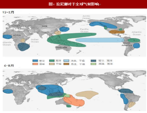 拉尼娜会对全球气候产生显著影响。拉尼娜是一种赤道东太平洋海温异常偏低的现象,与厄尔尼诺的海温异常偏高正好相反。海温的异常会反馈于大气环流中,继而造成天气和气候的异常。气候统计显示,在拉尼娜出现的年份,12-2月间,北美地区西北部寒冷多雨、美国南部则温暖干燥,南美地区东北部多雨,巴西南部则寒冷干燥,东南亚及澳大利亚北部多雨,我国东南沿海也降雨减少;6-8月间,巴西南部和阿根廷北部干燥,澳大利亚南部和东南亚多雨。