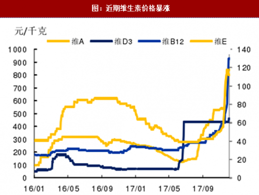维生素:去年巴斯夫德国工厂发生爆炸,导致维生素关键原料柠檬醛供给出现严重问题。加之今年环保督查力度加大,一批三废超排的维生素生产企业被勒令停产,更加加剧维生素供给不足的程度,下半年以来维生素价格再次出现暴涨。短期内,在环保严查、巴斯夫供给难以恢复情况下,维生素涨价恐将持续。