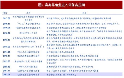 随着2014年环保法颁布起,畜牧养殖业逐渐进入环保高压期:2015年11月“水十条”规定2017年底前需依法关闭或搬迁禁养区内的畜禽养殖场(小区)和养殖专业户;2016年4月全国生猪生产发展规划(2016-2020)将全国生猪养殖划分为重点发展区、约束发展区、潜力增长区及适度发展区;2016年5月畜禽养殖禁养区划定技术指南明确规定禁养区划分依据;2016年11月“十三五”生态环境保护规划再次重申2017年底依法关闭或搬迁禁养区内的畜禽养殖场(小区)和养殖专业户。