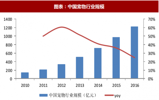 我国宠物行业的整体发展印证了这个逻辑,我国宠物行业规模 2010 年到 2016 年的年复合增长率达到了 40%以上,至 2016 年行业规模已达 1220 亿元。