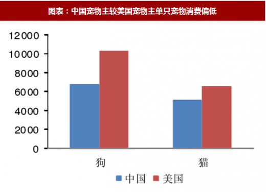 出于家庭成员情感需求以及从宠物情感需求的角度考虑,很多家庭会增加养宠数量,从单宠家庭转变为多宠家庭。目前我国的单只宠物消费偏低,单只狗的消费金额为6771元,与美国相比要低34%;单只猫的消费金额为 5082 元,与美国相比要低 23%。