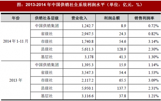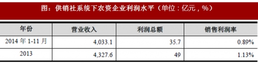 而供销社系统下农资企业的利润水平同样偏低,2013 年销售利润率仅为1.13%,而2014 年1-11 月份的销售利润率不到1%,体现了全行业利润微薄的现状。