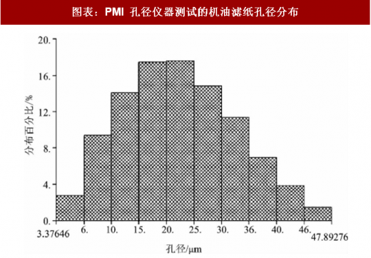 孔径是根据毛细现象原理对滤纸进行实验得到的计算值,单位是μm。孔径给出了滤纸孔隙特性方面的信息,可定性地间接反映滤纸的过滤效率的高低,但与滤纸的过滤效率无直接可换算的关系。通常采用的孔径测试方法是泡点法。这种测试方法只能得到最大孔径一个值,获取关于滤纸孔隙的信息较少。如果采用使用改进孔径测试方法的孔径分析仪,如 pmi 孔径分析仪对滤材进行测试,则可以得到平均孔径、孔径分布等更丰富的滤纸孔隙特性信息。