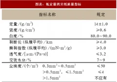 平板拷贝纸的切边应整齐、洁净。包装时纸张应整理整齐,且必须排气,避免鼓折。小包叠放必须垂直整齐,不允许有影响实用和美观的外观纸病,如折子、皱纹、残缺、裂口、砂子、洞眼、明显的毛布痕、鱼鳞斑、白线条、泡泡纱等。卷筒拷贝纸复卷端面整齐,洁净,不许有毛边现象;纸筒芯与切纸端面凹进或凸出不得超过 2mm,每卷纸的接头一等品应不超过3个,二等品不超过5个,且接头处应用胶带纸黏牢,并做出明显标记。根据市场要求,按照国家标准,拟定低定量拷贝纸的质量指标如表所示。
