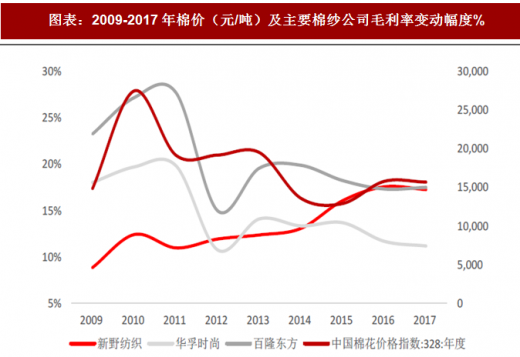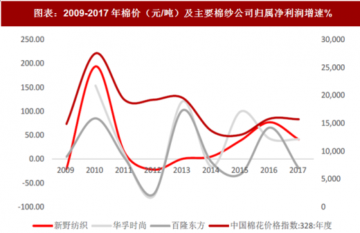 2016年棉纺企业业绩情况:2016棉价上涨,从毛利率看,2016年新野纺织受益明显,毛利率提升1.5pct,华孚时尚和百隆东方出现小幅下滑,但同期归属净利润提速明显,华孚时尚/新野纺织/百隆东方分别增长43%/77%/66%。华孚时尚2016年净利润增速放缓,主要因低毛利率的网链业务(2016年网链/纱线毛利率分别为3.76%/14.17%)占比快速提升所致(2015/16年网链业务收入占比分别为23%/39%)。