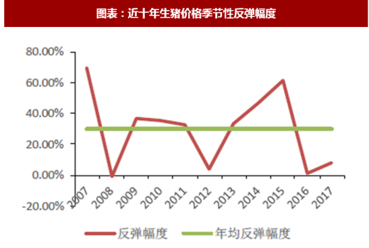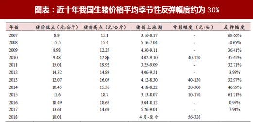 同时,我们通过统计2010年至今的生猪养殖亏损年份及亏损幅度发现,历年猪价跌破养殖成本线造成养殖户亏损时,猪价的季节性反弹幅度更为强烈,其中2010、2013、2014、2015年的反弹幅度分别是36%、33%、47%和61%。2018年3月至今猪价已创下近7年来新低,户深度亏损达300元左右。考虑到2018年春节较往年略晚以及春节期间母猪产仔率低影响5个月后生猪出栏,我们预计2018年6月起猪价大概率将启动季节性反弹行情。