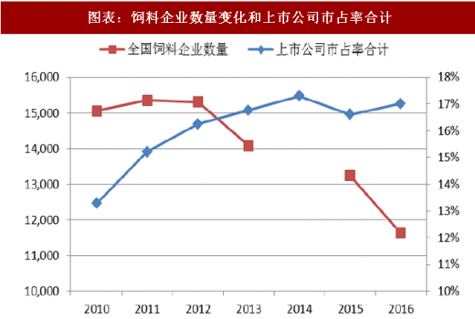从行业发展趋势来看,饲料行业高利润、高增长的时期结束,已经进入新的整合关键时期,整合提升、优胜劣汰、转型升级的速度加快。在经历了三十多年高速增长后,饲料行业于2013年出现了首次下滑,当年全国饲料产量1.93亿吨,同比下降1.8%,随后几年间饲料行业总量较为平稳。行业转为存量发展阶段,企业之间竞争加剧,中小企业面对资本压力、人才压力、技术压力等发展困难,将逐步被优势企业整合并购或退出市场,全国饲料企业数量由2010年的15000余家减少到了2016年的11000多家,预计后期将继续整合,企业数量进一步减少,优势企业市场份额提升。