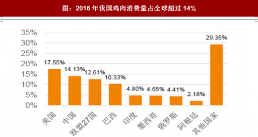 但是,这不全是中国人对鸡肉的偏好问题,更主要是中国人对肉类消费总体偏低的问题!这里有一组数据,2016年中国人均鸡肉消费约8.93kg,人均肉类(鸡肉 牛肉)消费约54kg;美国人均鸡肉消费约47.37kg,人均肉类消费103kg。由于人均收入差距和饮食习惯,中国人的肉类消费远低于美国等发达国家。