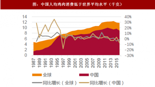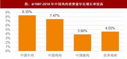 不仅总量不少,而且我国鸡肉消费也保持不错的增速。根据统计的近30年肉类消费的情况,我们不难发现,30年来,我国鸡肉消费量快速增长,增速超猪肉消费增速的接近一倍,也远高于世界鸡肉消费增速。