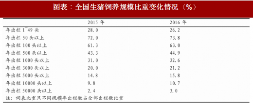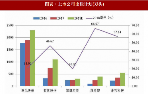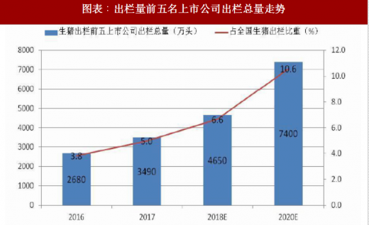 受环保政策影响,2015年起上市公司加快生猪养殖布局,抢占优质养殖土地资源,经过一年半到两年的猪场建设期,大部分上市公司生猪养殖新建产能从2016年开始释放。生猪出栏量前五名的上市公司2016年出栏量均在100万头以上,2017年出栏前五名上市公司出栏总量同比增长30% 。预计到2018年,生猪出栏量前5的上市公司共出栏生猪4650万头,占全国总出栏量的6.6%,出栏量继续侧寺30%增速。预计到2020年,5家上市公司生猪出栏总量将达到7400万头,占全国出栏总量的10.6%, 2016-2020年出栏量复合增速30%。
