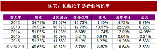需求端来看,包装用纸的需求主要受下游行业和终端消费增长的影响, 目前包装纸下游行业主要为物流、日化用品、、和消费电子, 综合数据来看,下游行业物流、日化用品和消费电子处于高速增长阶段, 2012-2016 年复合增长率在 40.63%、10.32%和 10.64%,其它行业保持较 稳定的增长,下游行业增长为包装纸提供需求支持。从季节性变化来看,5 月过后包装纸进入传统旺季,啤酒、饮料的需求增加带动包装纸需求上升; 此外,随着 618 购物节的到来,许多厂家开始提前备货,以应对未来快速上涨的商品和物流包装需求,今年 6 月 14 日 -7 月 15 日世界杯足球赛的举行,部分企业更换新型包装以利用“世界杯”推动产品销量,如蒙牛推出世界杯 专供主题包装等,这些需求将在下半年季节性释放,并推动废纸价格提升向 终端箱板瓦楞纸价格传导。我们认为,箱板瓦楞纸供需格局紧平衡,伴随传 统旺季的到来,下半年将推动纸价进一步上行。