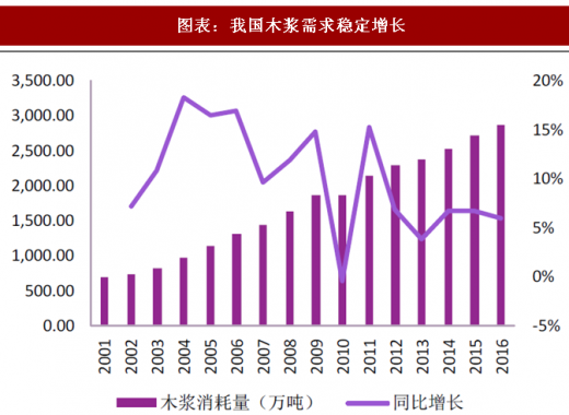 从需求方面看,我国木浆需求稳定增长,支撑木浆价格。一方面,随着 经济形势的复苏,木浆需求端纸张景气较高,我国木浆消耗量稳步增长, 2014-2016 年增长率保持在 6%-7%;另一方面,在供给侧改革和环保执法下造纸企业竞争格局得到优化,随着落后产能和高污染产能的退出,大企业 生产步入良好态势发展,未来对于木浆的需求将持续增加;替代性方面,由 于废纸进口政策对于废纸价格和数量的影响,木浆需求将进一步上升,为木 浆价格提供强支撑,因此我们预计未来木浆价格将维持高位。