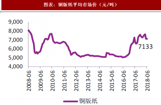 文化纸传统旺季叠加浆价上涨,文化纸价格高位运行。2018 年以来, 受新政和供需格局影响,内外盘浆价均处于历史高位,成本端压力 下木浆系纸种价格整体呈现上升趋势,同时 1-5 月为文化纸传统季节性旺季,市场需求推动文化纸价格高位运行。截至 6 月 8 日,铜版纸平均市场价为7133 元/吨,双胶纸平均市场价为 7333 元/吨,铜版纸较年初下降了 1.39%, 双胶纸较年初上涨了 3.28%,二者同比增长 5.41%和 14.73%。