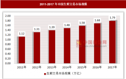 得益于国内庞大的人口基数,人们对于生鲜的需求越来越大,截止到2017年,已经达到了1.79万亿的市场交易规模。