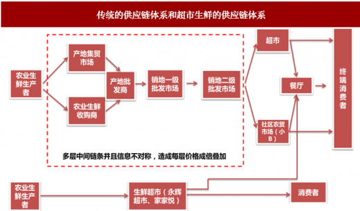 目前,国内生鲜供应链体系存在两种模式,传统的供应链体系和现代化超市的供应链体系;而开放平台式的生鲜供应链体系正在形成,以永辉彩食鲜、美菜、宋小菜、善之农为代表的第三方供应链体系,控货不控店整合上游种植养殖基地,收集小b端订单,实现规模集采集运等。而对比来看,封闭式的现代化体系超市效率更高,开放式的生鲜供应链体系次之,但整体高于传统的生鲜采购模式。