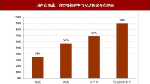 当前我国果蔬、肉类、水产品的冷链流通率,即在物流过程中采用冷链物流的比重,分别为22%、34%、41%,冷藏运输率分别为35%、57%、69%,与发达国家平均水平差距巨大。远距离运输需要较完善的基础设施,而从冷藏车的以及冷库角度来看,国内在基础设施方面存在较大的不足,导致生鲜(蔬果、水产品、肉制品等)运输半径小(一般为1-20公里),本地化消费占多数,而在需求比较旺盛的区域,存在供给不足的情况,产品价格较高,同时在运输过程中存在较大的损耗,供给与需求存在失衡。