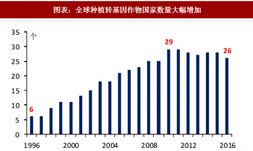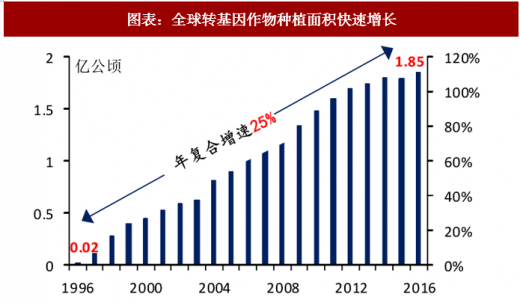 全球转基因作物种植面积快速增加。转基因作物商业化种植始于1996年,由于转基因技术能明显降低种植成本、提高经济效益,转基因作物种植面积快速增长。 2016年全球转基因作物种植面积达到1.85亿公顷,约占全球总耕地面积14%,较 1996年种植面积增长90倍以上,年复合增长率达到25%;全球种植转基因作物国家数量也由1996年6个增长至26个。