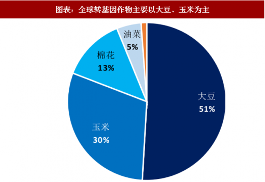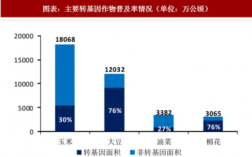 目前全球转基因作物种植主要以、为主,大豆、棉花普及率最高。2015 年全球1.8亿公顷转基因种植面积中,转基因大豆、转基因玉米种植面积分别达到9165万公顷、5391万公顷,占比达到51%、30%。目前大豆、棉花转基因种植普及率较高,均达到76%;玉米、油菜普及率分别为30%、27%。