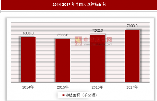 近年来我国由于国家政策引导农户减少玉米种植面积,提倡粮豆轮作,加之春播前市场价格同比下跌,使得大豆种植面积同比明显增加。截止2017年我国大豆种植面积达到7900千公顷,较上年增长9.7%。