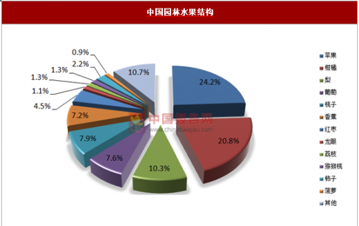 从我国从我国水果生产结构看,苹果、、的产量居前列,合计约占55.3%,但相比1978年下降15.7个百分点,表明我国水果生产品种日渐丰富,生产结构更加合理。2017年我国居民人均水果占有量为131kg,比世界平均水平高34kg/人,我国水果产业基本能满足人们日常所需。