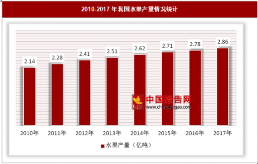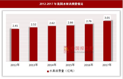随着我国人们生活水平的大幅提高,我国居民对水果的需求不仅仅体现在绝对量的增长,还体现在了对品质、品质方面。受生活方式不同、 收入差距、 城乡二元结构等影响, 城镇居民和农村居民的水果消费还存在较大差异, 农村居民的消费模式正朝着城镇的消费模式改变,这意味着未来几年我国城镇居民人均水果消费量将稳定在目前水平, 而农村居民对水果的需求仍有很大提升空间, 农村居民对水果的消费增幅将高于城镇居民。2016年我国水果消费量达到了2.76亿吨,2017年进口水果数量不断增长,消费量突破了3亿吨。