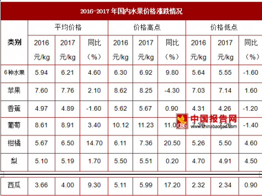 在价格方面。2017年我国水果批发价格指数为125.08,同比上涨3.4%。具体来看,2017年我国苹果、香蕉、葡萄、柑橘、梨、西瓜6种水果批发价格同比上涨4.6%,其中,仅香蕉平均批发价格低于2016年水平;6种水果的批发价格高点同比上涨9.8%,其中,柑橘、西瓜、葡萄涨幅居前,分别上涨20.5%、17.2%和11%,仅苹果价格高点同比下降4.3%;而受2017年全国水果普遍丰产影响,6种水果批发价格低点同比下降1.6%,其中,葡萄、香蕉分别下降1.4%和1.2%。