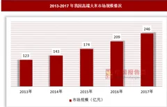 从目前来看,高端大米市场与我国收入总体水平、收入结构和相应的消费结构相关度很高,也受到了食品安全因素、城镇化水平及人口结构因素的影响。因此,行业存在的一定的区域性。但随着我国经济的不断增长,消费结构不断升级,消费区域会逐渐增大,对高端大米的需求也会不断增加。2013年我国高端大米的市场规模约为122.5亿元,到2017年增长到了246亿元。