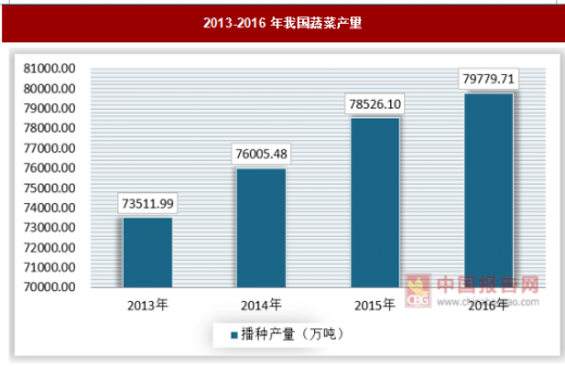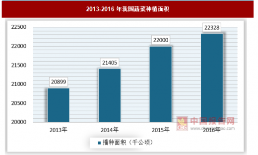 近年来随着人们生活水平的提高,市场对于蔬菜的需求日益强劲,蔬菜的种植面积和产量呈上升态势。蔬菜的种植面积从2013年的20899千公顷增长到2016年的22328千公顷。