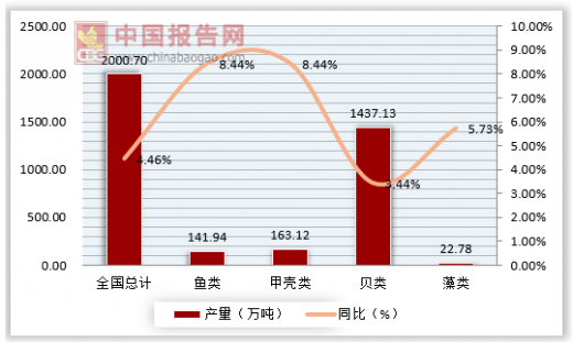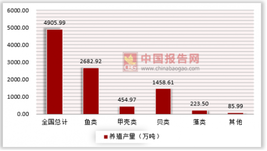 2017年中国水产养殖总产量4905.99万吨,其中海水养殖总产量2000.70万吨,同比增长4.46%;淡水养殖总产量2905.29万吨,同比增长0.95%。