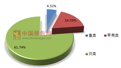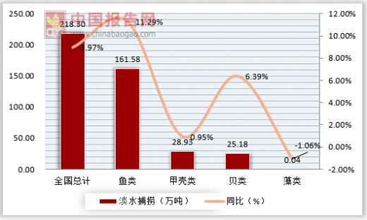 2017年全国国内水产捕捞总产量有1330.72万吨,其中鱼类捕捞926.79万吨,甲壳类236.52万吨,贝类69.47万吨,藻类2.03万吨,头足类61.66万吨。