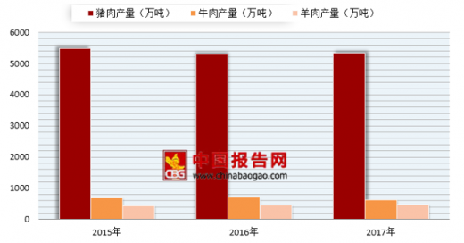 从肉类品种来看,2017年,猪肉、羊肉产量略有增长、牛肉产量下降。2017年猪肉产量5340万吨,比2016年增加41万吨;牛肉产量635吨,比2016年减少81万吨;羊肉产量471万吨,比2016年增加12万吨。