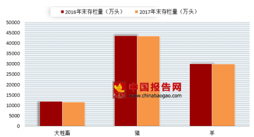 根据统计局公布数据显示,2017年,我国畜牧业大牲畜(包括牛、马、驴、骡、骆驼等)的年末存栏量为11576.7万头,比2016年减少了329.71万头。其中牛年末存栏量为10382.97万头,比2016年减少了284.93万头;马年末存栏量为526.91,较2016年减少23.83万头;其中驴年末存栏量为447.48万头,比2016年减少了9.37万头。2017年,猪年末存栏量为43325万头,比2016年减少了179万头;羊年末存栏量为29903.7万只,比2016年减少了208.32万只。