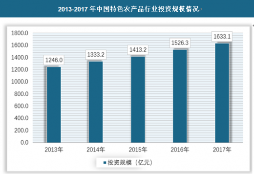 2017年我国特色农产品行业投资规模已经达到1633.1亿元,同比增长6.9%,具体如下: