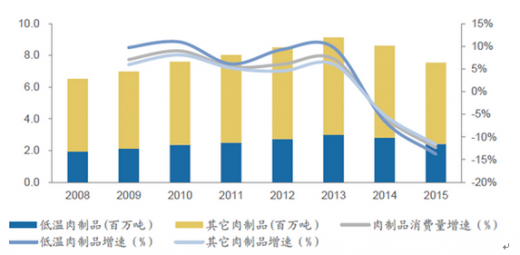 我国肉制品消费结构中,低温肉制品仅占三成,与欧美日本等差距较大。由于我国饮食习惯的不同,以及火腿肠等中式肉制品的流行,目前我国肉制品消费结构中仍以中高温肉制品为主,低温肉制品仅占三成。而日本市场中,家庭消费的肉制品中三大类低温肉制品(培根、火腿、香肠)占比高达90%,低温肉制品是主要消费对象。目前我国低温肉制品占比较低,发展空间巨大,未来将是主要发展趋势。